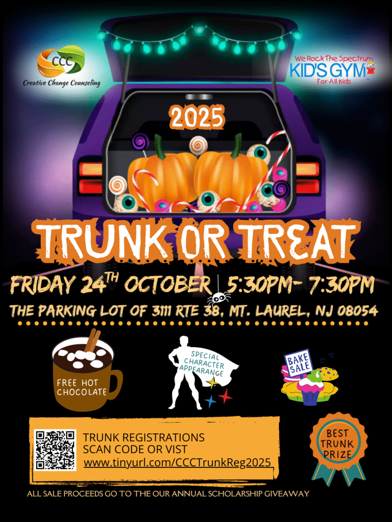 Creative Change Counseling is hosting a Trunk or Treat Event on Friday, October 24, 2025, from 5:30 PM – 7:30 PM
